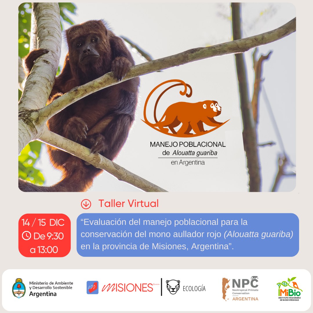 Este 14 y 15 de diciembre se llevará a cabo el Taller virtual “Evaluación del manejo poblacional para la conservación del mono aullador rojo (Alouatta guariba) en la provincia de Misiones, Argentina”. El encuentro organizado en conjunto por el Plan Nacional de Conservación de Primates de Argentina, la Dirección Nacional de Biodiversidad del Ministerio de Ambiente y Desarrollo Sostenible de la Nación, el Ministerio de Ecología y R.N.R. de la Provincia de Misiones y el Instituto Misionero de Biodiversidad (IMiBio) se desarrollará de forma virtual de 9.30 a 13 horas.