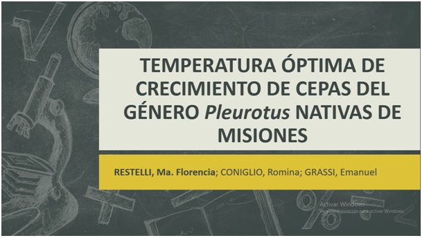 El trabajo titulado “Temperatura óptima de crecimiento de cepas del género Pleurotus nativas de Misiones” fue presentado por la Bióloga Restelli, Ma. Florencia. El mismo tiene como objetivo la determinación de la temperatura ideal para el crecimiento de cepas nativas de Gírgolas provenientes de la Selva Paranaense. Para ello, se cultivaron 5 cepas de Pleurotus a distintas temperaturas (25, 30 y 35ºC) y se midió su crecimiento diario. Los resultados fueron prometedores y la cepa de Pleurotus albidus creció 1.25 cm/día a altas temperaturas (25-30ºC), lo que influiría en la reducción del gasto energético para mantener las condiciones necesarias para el cultivo intensivo. Además, su presencia en la provincia y estudios sobre sus propiedades nutricionales remarcan el potencial para incluirse en el mercado local.
