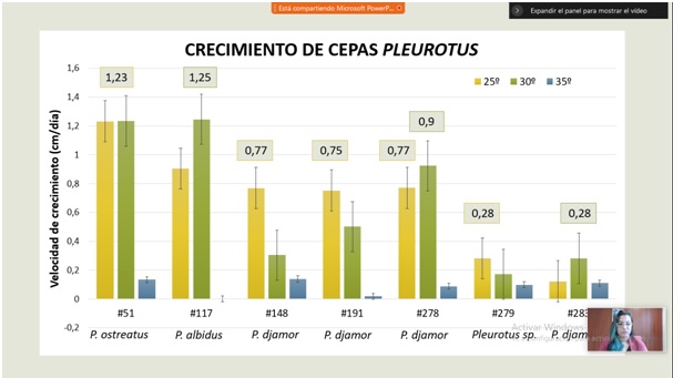 El día jueves 5 de agosto se expusieron los primeros resultados de la investigación en cepas de Pleurotus nativas en la sesión de “Bioprocesos en la industria alimentaria y remediación ambiental” durante la segunda jornada de la SAPROBIO 2021.