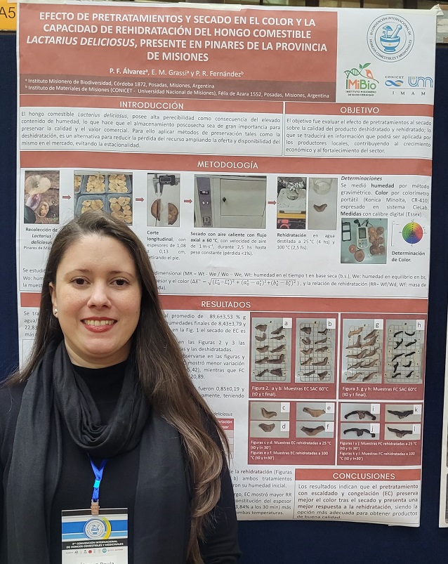 Algunos de los pósteres presentados se orientaron hacia aspectos tecnológicos y nutricionales de especies comestibles de la funga de Misiones. Uno de ellos, “Efecto de pretratamientos y secado en el color y la capacidad de rehidratación del hongo comestible Lactarius deliciosus, presente en pinares de la provincia de Misiones”, analizó el efecto de los métodos de procesamiento sobre la calidad del producto final. Mientras que en el trabajo “Perfil nutricional y compuestos fenólicos de los hongos comestibles Lactarius deliciosus, Macrolepiota sp. y Phlebopus sp. de la Provincia de Misiones”, se expuso una caracterización detallada del valor nutricional y los compuestos bioactivos presentes en esas especies. Estos aportes refuerzan la relevancia del estudio integral de la funga local como recurso estratégico para el desarrollo sustentable.