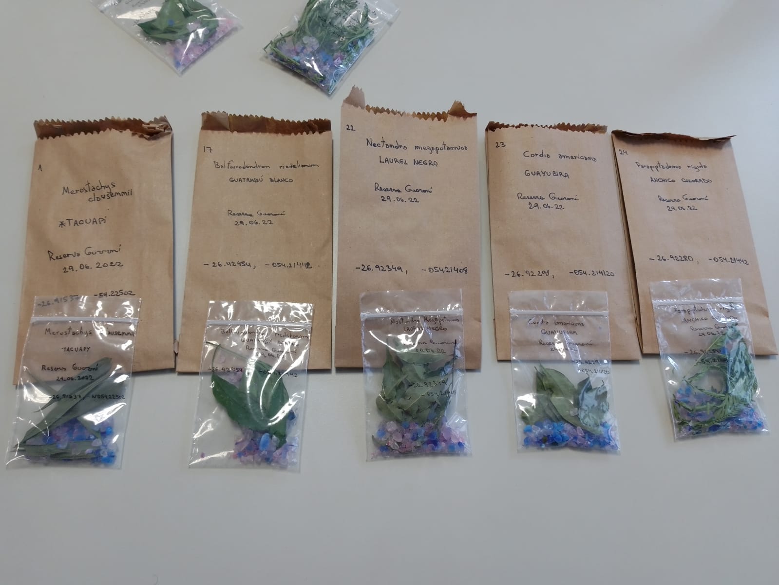 * De las muestras colectadas, se apartaron hojas (tejido foliar) en buen estado que fueron resguardadas con silicagel, para su almacenamiento y posterior procesamiento en el Laboratorio de Biología Molecular, la extracción de ADN del material recolectado, y su resguardo en el Biobanco (Banco de ADN). A su vez, y con los mismos fines de resguardo del material genético de las muestras de hongos colectadas, se realizó una selección de aquellas de interés, y estas fueron resguardadas en crioviales con CTAB al 2% para su posterior procesamiento en el laboratorio de Biología Molecular.