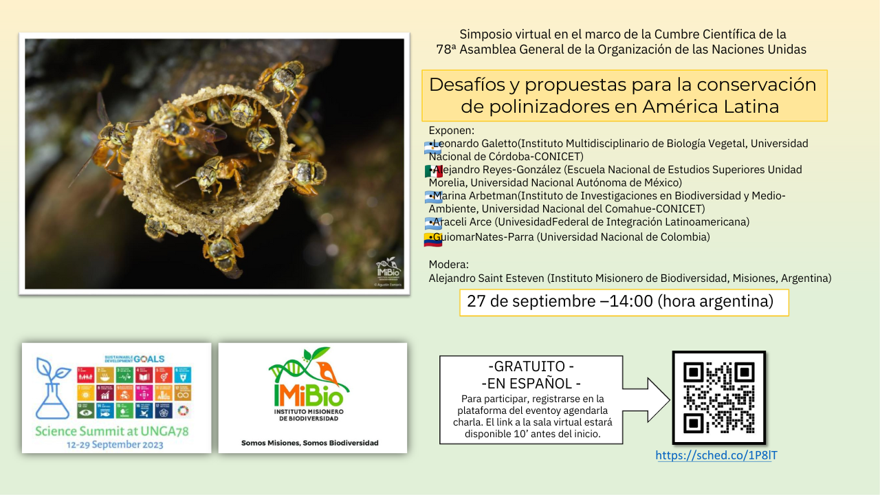 En la primera, el Lic. Alejandro Saint Esteven del IMiBio, en representación de la institución que preside la Mgtr. Arq. Viviana Rovira, moderará la Mesa virtual “Desafíos y Propuestas para la conservación de polinizadores en América Latina”. Sus disertantes son el Dr. Leonardo Galetto del Instituto Multidisciplinario de Biología Vegetal; Dr. Alejandro Reyes-González de la Universidad Nacional de México; Dra. Marina Arbetman del Instituto de Investigaciones en Biodiversidad y Medio-ambiente de la Universidad Nacional del Comahue; junto a la Dra. Guiomar Nates-Parra de la Universidad Nacional de Colombia y la Lic. Araceli Arce, representante de la Universidad Federal de Integración Latinoamericana. La sesión servirá de plataforma para contarle al mundo el Proyecto “Biodiversidad y Meliponicultura” que desarrolla el IMibio desde el 2022, con el objetivo de promover y poner en valor la cría de abejas nativas de Misiones sin aguijón, siendo las principales la de la especie Yateí, género Tetragonisca, cuya miel es reconocida y apreciada en todo el continente por su propiedades alimenticias y medicinales.